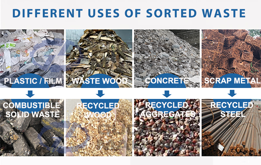 Landfill waste can be recycled and reused after treatment: metals can be processed into recycled steel; waste bricks and concrete blocks can be crushed into recycled aggregates for the production of environmentally friendly building materials; combustibles such as plastics and textiles can be made into RDF fuel rods for power generation; and the separated humus can be used for landscaping and soil improvement.